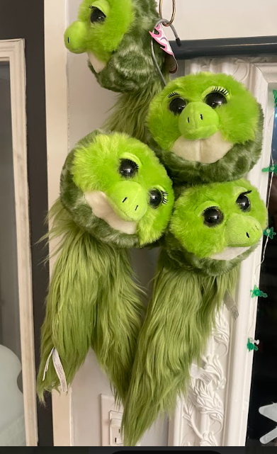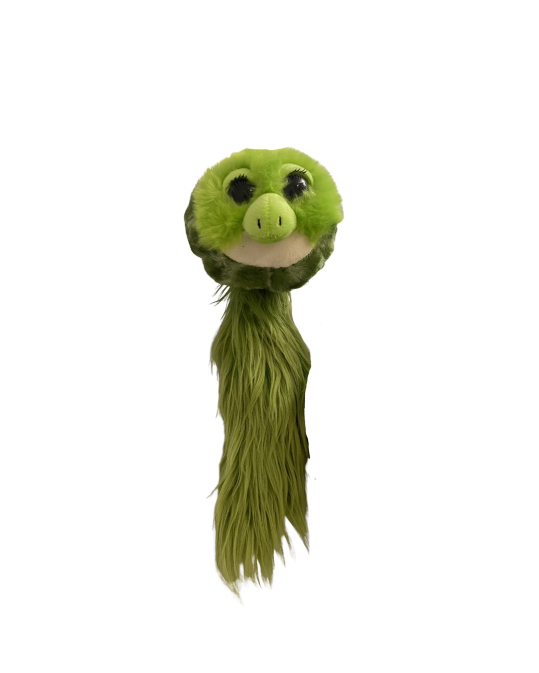 A silly turtle-like stuffy with long lashes and an even longer tail!