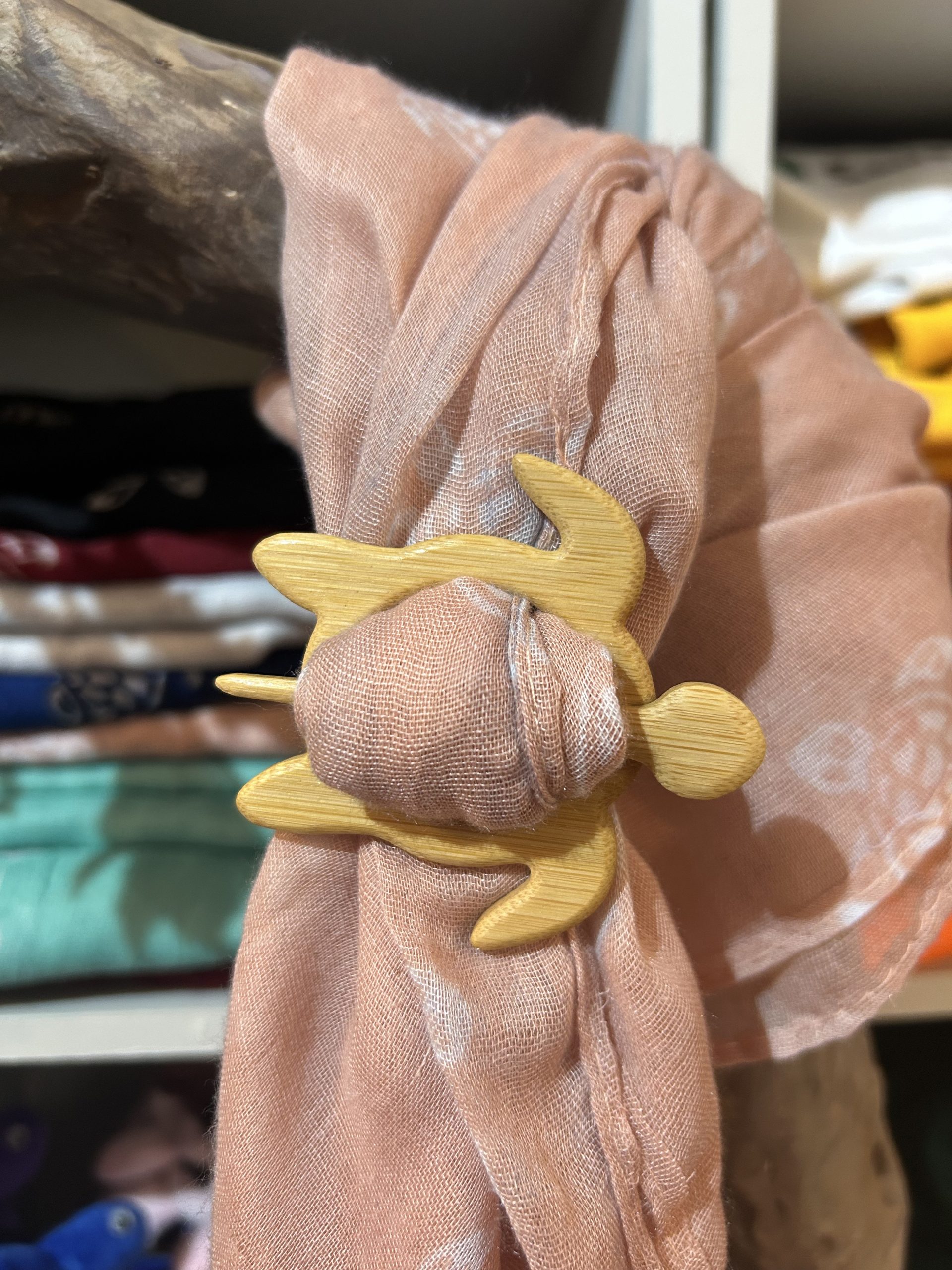 Beautiful, colourful and fun. Thin cotton dyed scarves, comes with wooden turtle scarf clip. They make a great gift!